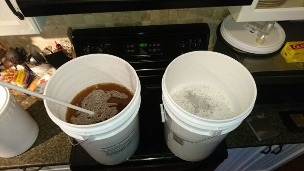 Now it’s time for serious business. I get my tea pail up into my kitchen along with another empty pail for the second batch. I drag out all of my equipment and ingredients. Both batches will be pretty similar but there will be minor differences. They are using the Ancient Orange recipe, one will follow it completely, and one will deviate, trying to bring out a more aggressive flavour.